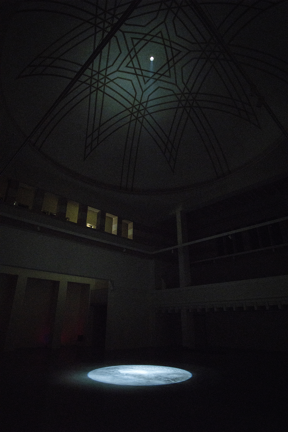 The exhibition "something's wrong and i can feel it" uses the given architectural elements of the New Synagogue space. By uncovering the opening that is present in its dome, if the space is sufficiently darkened, the image is projected onto the floor directly beneath the dome, recontextualizing the building as a "camera obscura," a simple optical device that predates the invention of the photographic apparatus. The projected image depicts atmospheric changes in the sky above the New Synagogue building, with the resulting image being dynamic and transforming over time beyond the artist's control. The perception of a given image requires a certain degree of concentration on the part of the viewer and a physical adaptation to the new conditions.