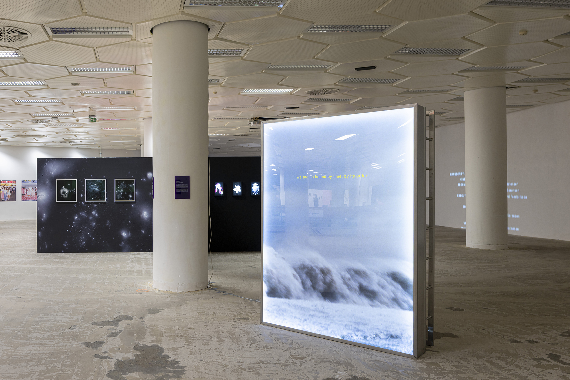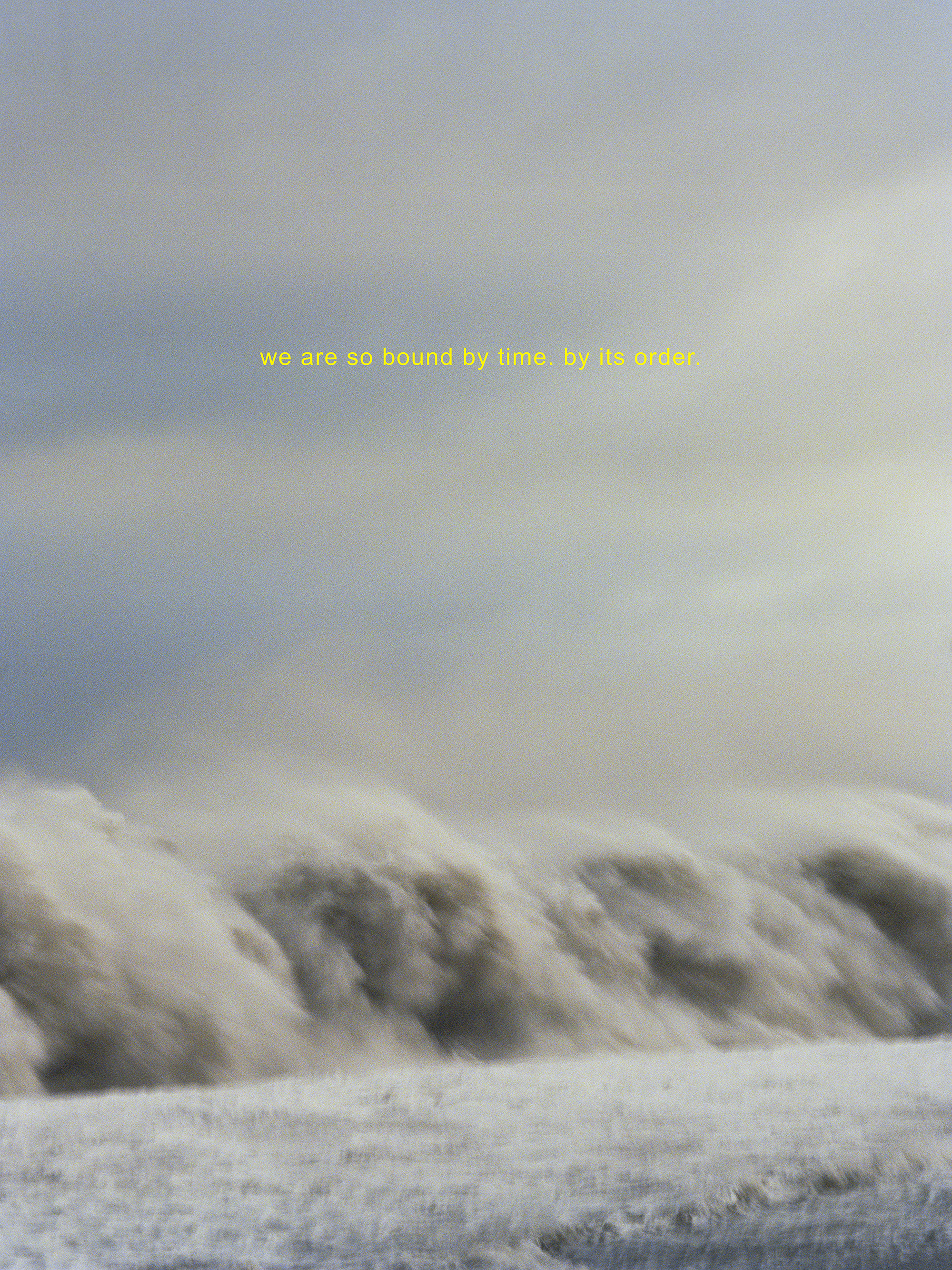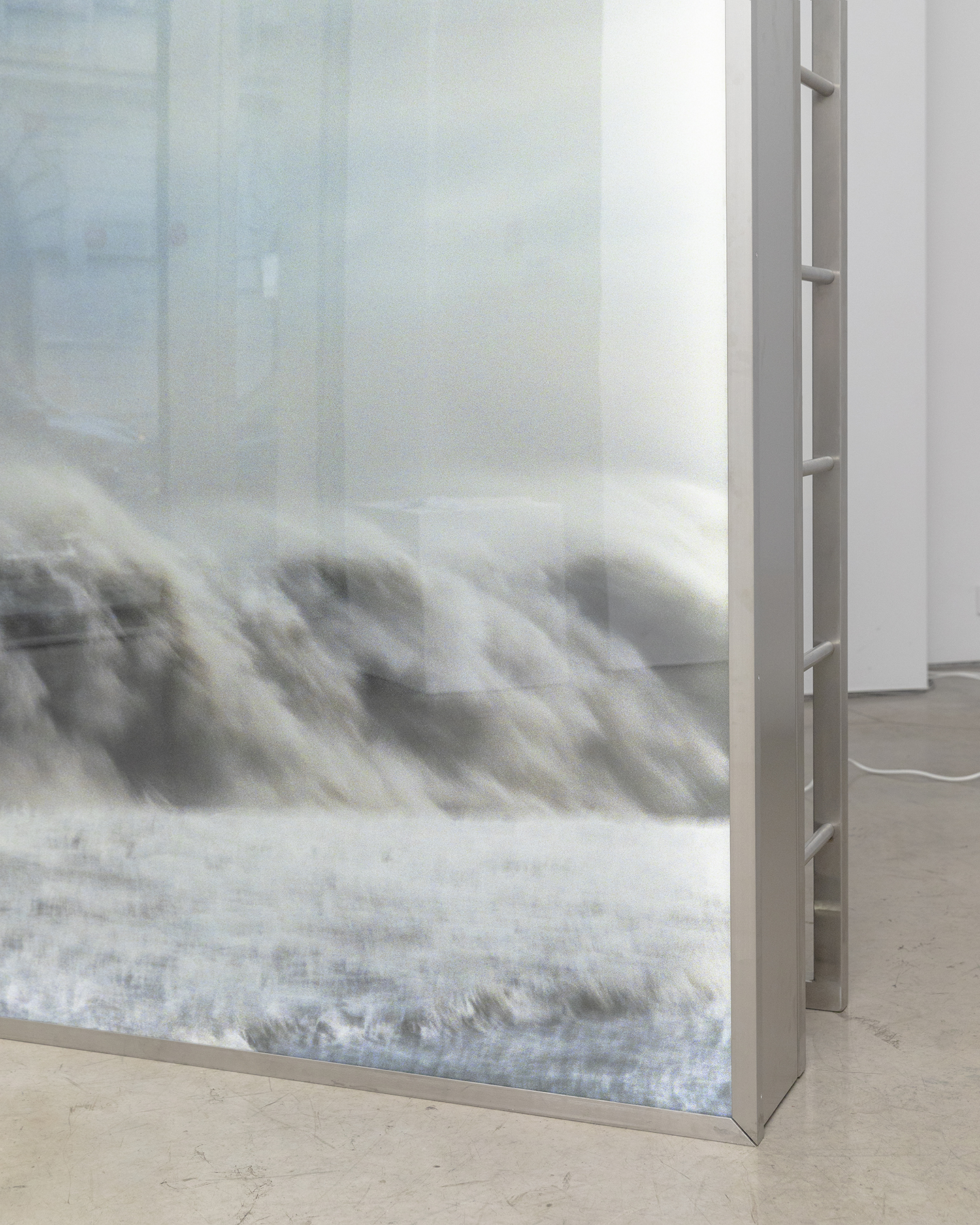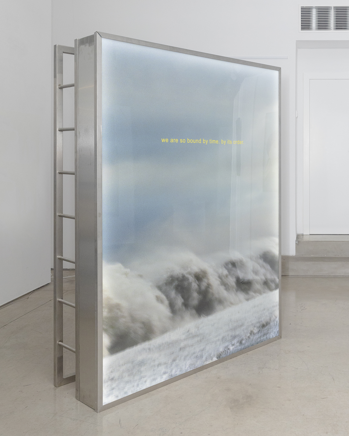 Untitled (Climber) is an object that operates at the intersection of image, structure, and embodied perception. The work is defined by a large-scale printed image encased within a surrounding metal construction. The image captures waves breaking along a shoreline, frozen in a moment of motion. While the scene initially evokes romantic associations, it simultaneously carries an undercurrent of unease. Through this ambivalence, the artist draws attention to climate catastrophe, the regenerative and destructive capacities of nature, and humanity’s persistent inability—or refusal—to either protect the natural world or extricate itself from its consequences. Superimposed on the image is the phrase “we are so bound by time. by its order.” Quoted from Denis Villeneuve’s film Arrival (2016), the text gestures toward the present moment while invoking the disproportion between the brevity of individual human existence and the vast temporal scale of geological and cosmic time. In this context, the quotation underscores the instability of linear conceptions of time and space, exposing the limits of human perception and understanding. In contrast to the fluid, organic imagery, the surrounding metal structure is sharp, austere, and markedly industrial. Its defining element is a ladder that frames the image from behind. The structure is unmistakably anthropocentric in scale and design: its intended mode of use is immediately legible, and the viewer can almost physically sense the coldness of metal against the skin. As such, the object anticipates performative engagement—an action that is implied rather than fully realized. Although the form suggests playfulness and interaction, it ultimately speaks to absence, restraint, and deferred action. Interpretation of the object remains inherently subjective, yet it is clearly conceived as a physical confrontation between viewer and structure. Exceeding the viewer’s bodily dimensions, the work invites reflection not only through spatial presence but also through self-recognition: the plexiglass surface reflects the viewer’s image, implicating them within the work’s conceptual framework.